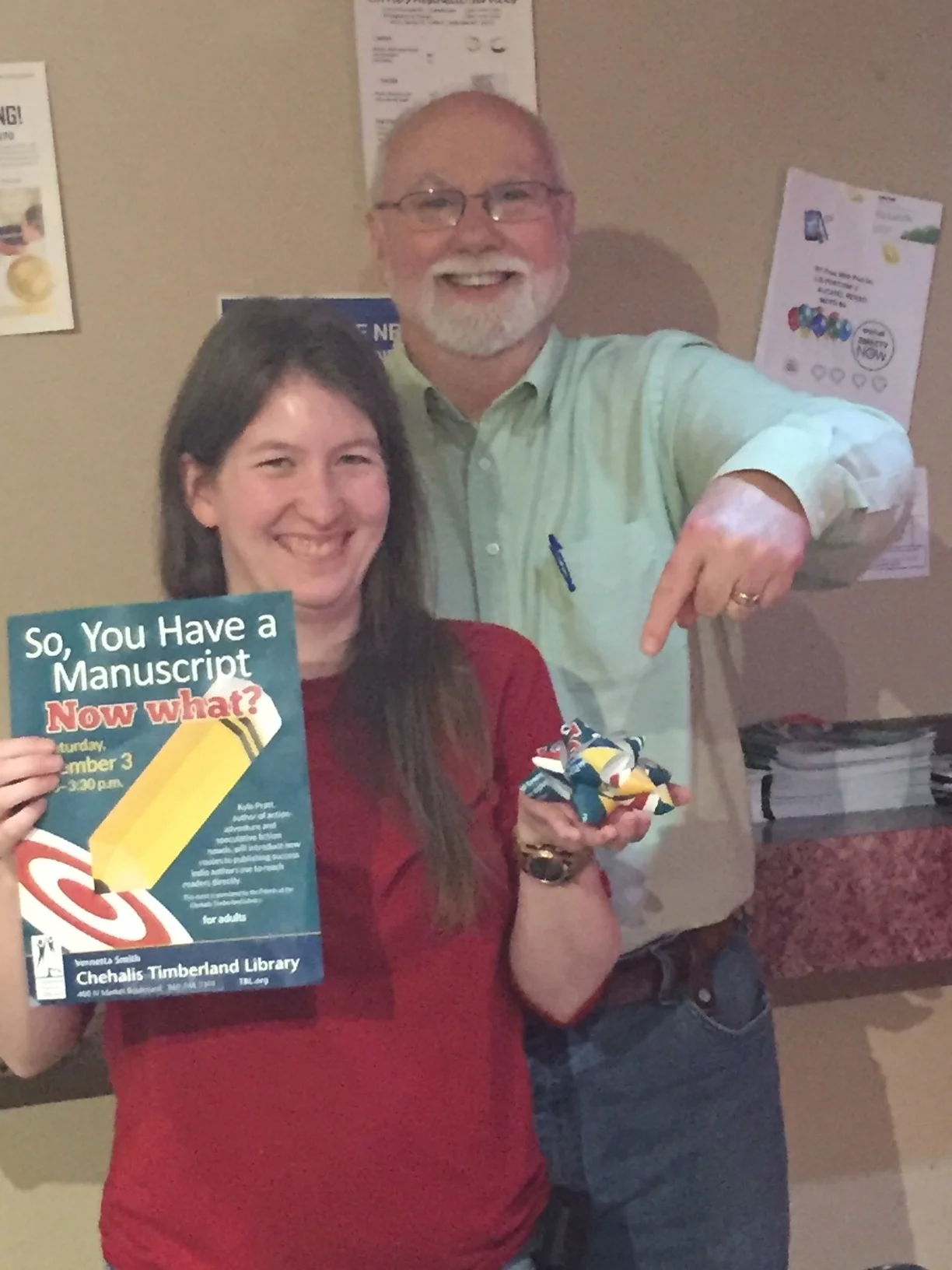 I’m not sure if Amy considers herself a busy person, but it seems like it to me. A few days ago I taught a class, So, You Have a Manuscript, Now What?, at the Chehalis library. It has often been said that authors write because the page is blank, painters fill a canvas because it’s empty. When my Library talk was done Amy removed the poster and later made it into a bow. Why? For the same reason climbers summit a mountain—it was there.